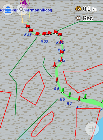 - OSM markeert de vaarweg als een groene weg. Soms is dat handig. Met name als alleen rode of groene boeien zijn gelegd.
